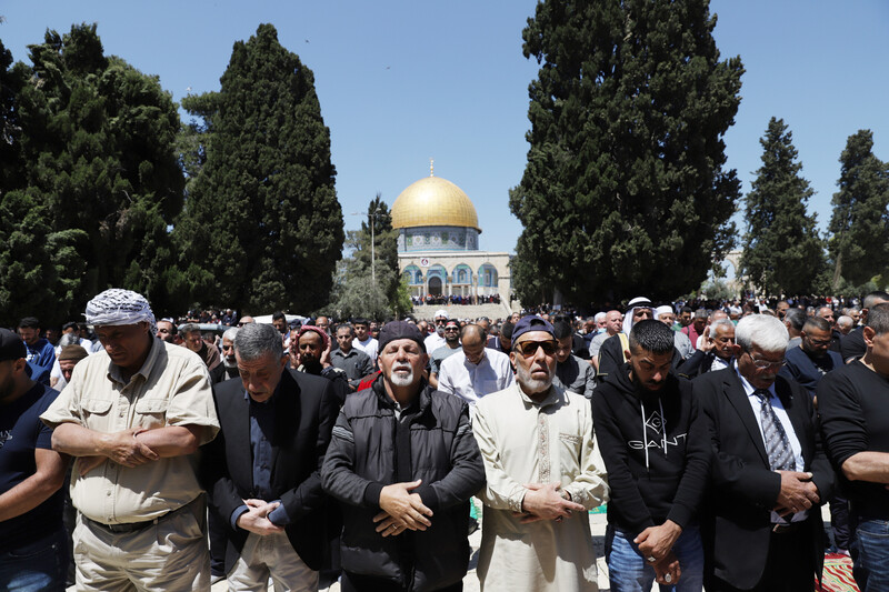 Palestinians worship outside the Dome of the Rock at the al-Aqsa mosque compound in Jerusalem’s Old City on 15 April. Jeries BssierZUMA Press